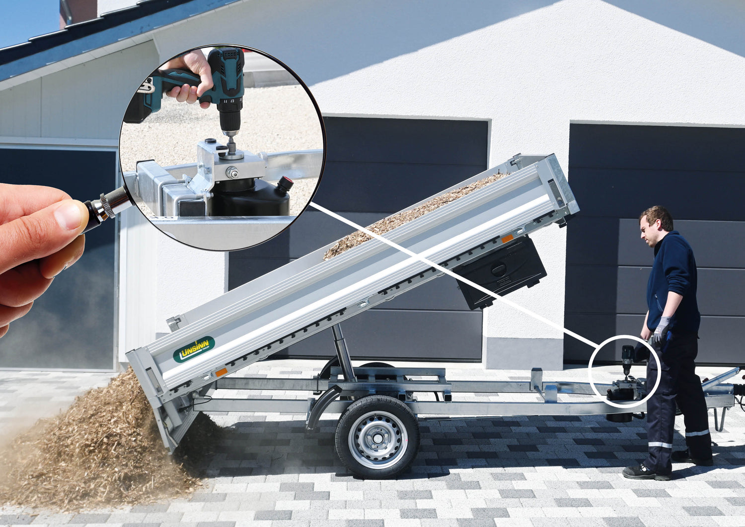 Das Kippen Ihres Anhängers lässt sich jetzt einfach und bequem mit dem Akkuschrauber durchführen. Verabschieden Sie sich vom anstrengenden Pumpen per Hand und kippen Sie den Anhänger ganz bequem mit dem Akkuschrauber. Möglich macht dies die innovative PUMPLESS Hydraulik von UNSINN.